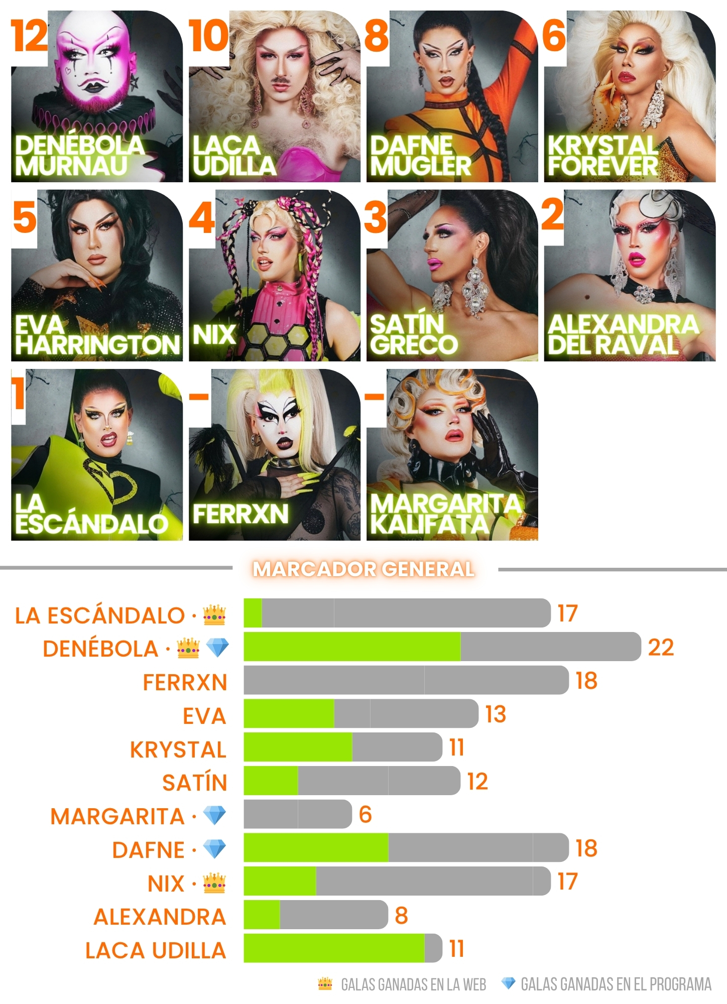 - Laca Udilla | ★★★ | Por fin Laca Udilla dio en el challenge lo que siempre da en los confesionales: diversión, mordacidad y una elegancia que siempre tiene un pie en la tontería. Su traje de alfombra pisoteada al tiempo que caminaba con un diseño bien ajustado y con bastón era un contraste estupendo.