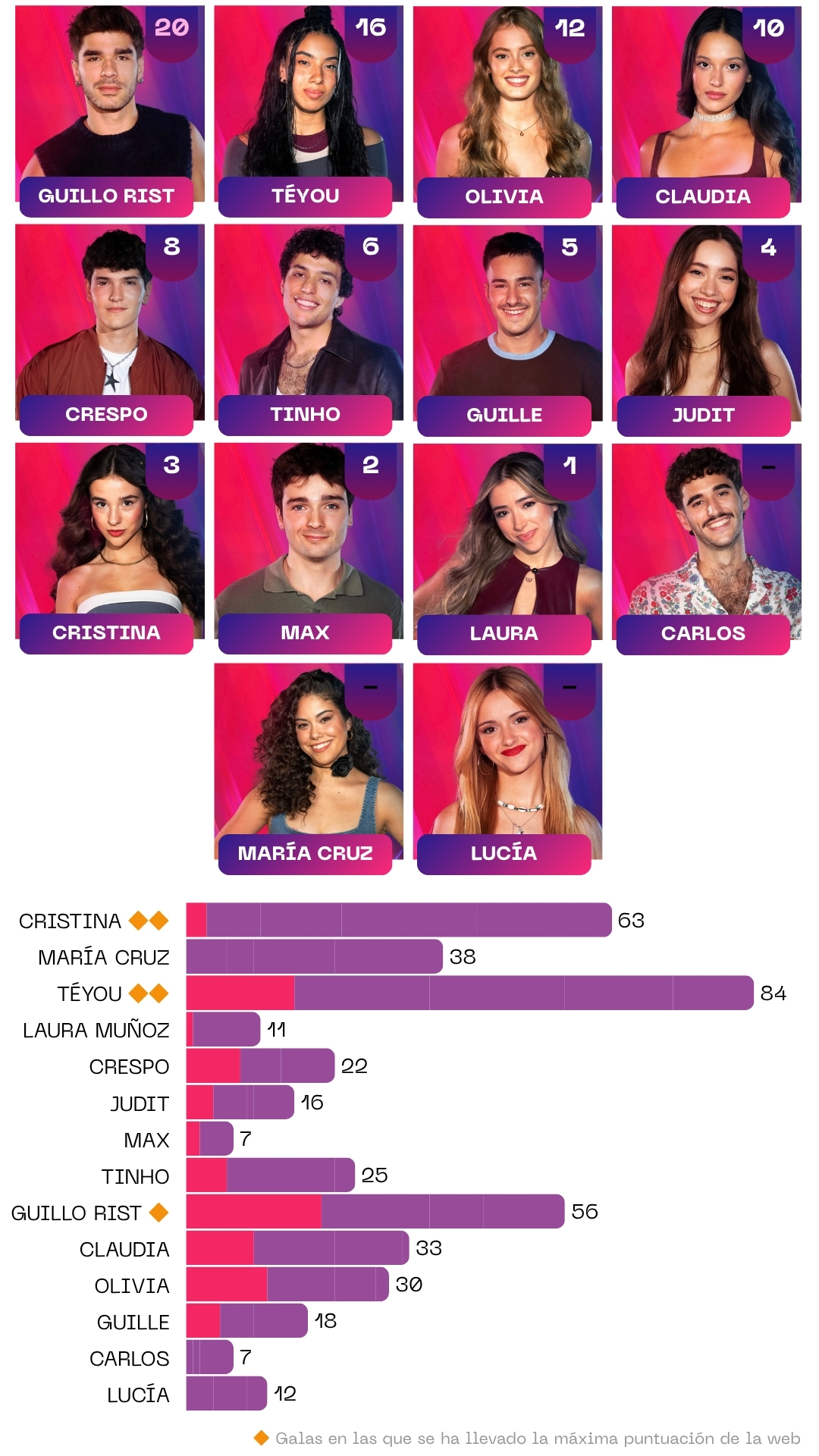 Guillo estuvo mejor que Guille, porque Guillo es de esas personas que se lo creen. Y en la industria de la música, te lo tienes que creer. Ese creértelo se puede trasladar de formas muy distintas a escena, pero si no está uno convencido, ¿cómo pretende que lo esté el resto? Guille puso más esfuerzo del que habíamos visto durante la semana, se dejó contagiar por su compañero, pero había momentos de “concursante actuando con el invitado”.